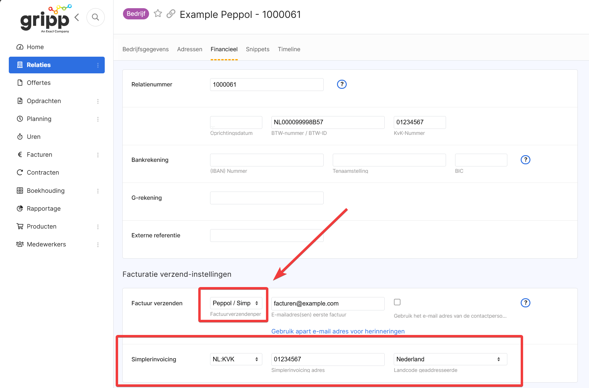 Zodra je na het activeren van Peppol een Relatie opent, naar tabblad 'Financieel' gaat en hier op 'Bewerken' klikt, kan je bij Factuur verzenden kiezen voor 'Peppol / SimplerInvoicing'. Wanneer je deze optie selecteerd, krijg je extra invoervelden die ingevuld moeten worden.